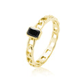 Deze goud vergulde ring is vervaardigd van 925 sterling zilver en afgewerkt met een rechthoekige zwarte zirconia. De schakelvormige band geeft het ontwerp een krachtig maar verfijnd karakter, terwijl de gladde afwerking zorgt voor een rustige uitstraling.