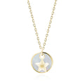 Deze goud vergulde ketting is vervaardigd van 925 sterling zilver en afgewerkt met een ronde parelmoer hanger, waarin een subtiele ster is verwerkt. De combinatie van het zachte parelmoer en het verfijnde sterdetail geeft het ontwerp een rustige en tijdloze uitstraling.